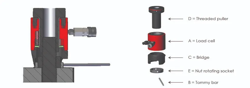 The table below provides all the information to select the components, comprising of short threaded adapter, load cell, small bridge, small nut rotating socket and tommy bar, to modify your existing tensioner to suit another bolt size. Changes are only possible within the same tensioner size. It is essential that all the components or selected conversion kits have the same suffix as the target tensioner size (i.e. B1, B2 or B3).