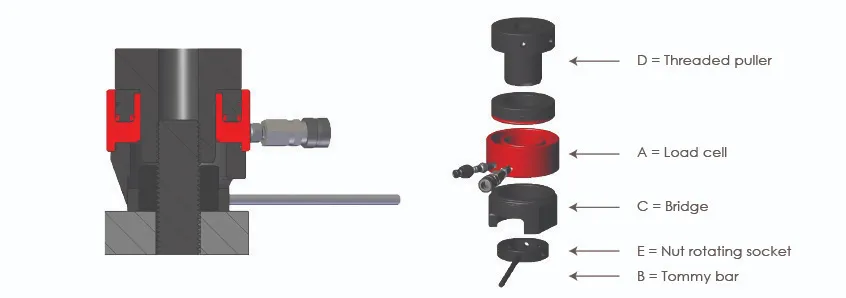 The table below provides all the information to select the components, comprising of short threaded adapter, load cell, small bridge, small nut rotating socket and tommy bar, to modify your existing tensioner to suit another bolt size. Changes are only possible within the same tensioner size. It is essential that all the components or selected conversion kits have the same suffix as the target tensioner size (i.e. B1, B2 or B3).